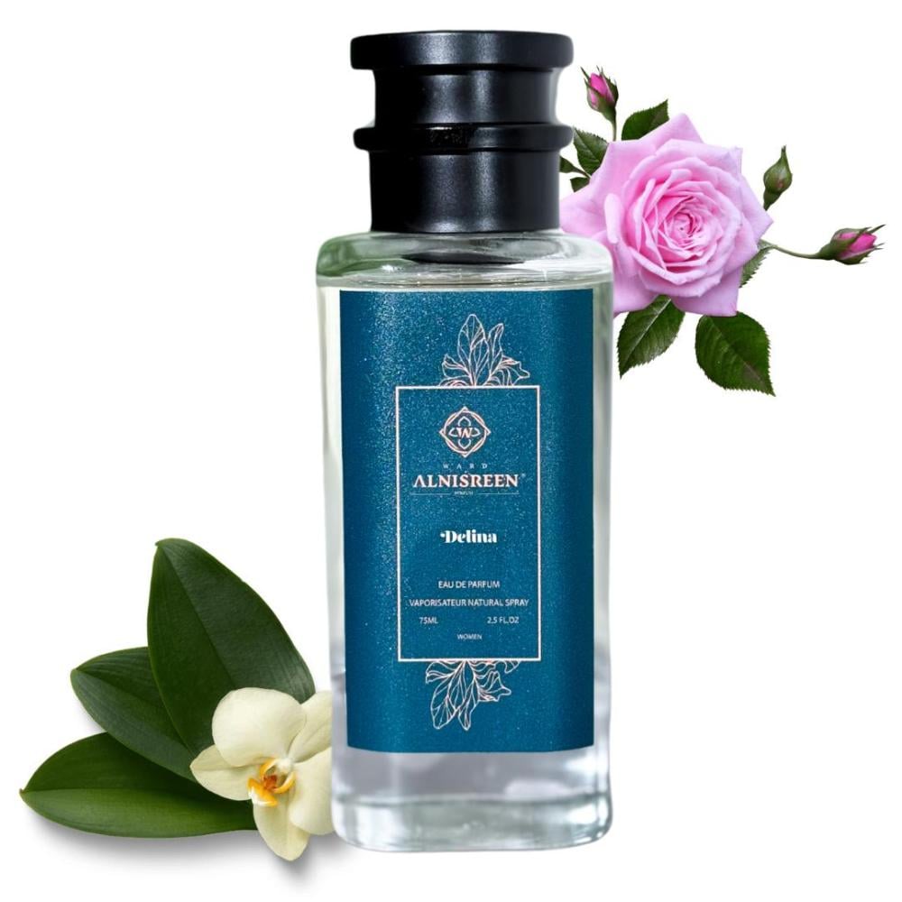 عطر Delina للنساء. يتميز بتركيبة عطرية أنثوية راقية تجمع بين نفحات الأزهار والفواكه والمسك.